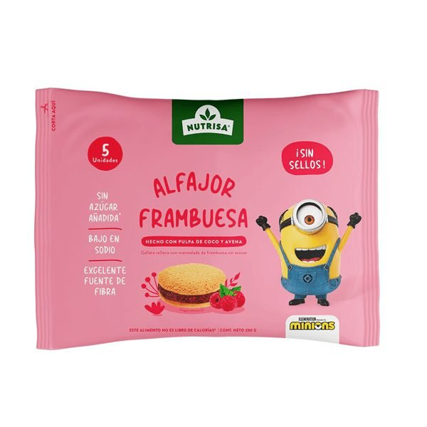 Alfajor relleno con mermelada de frambuesa elaborado a base de pulpa de coco y avena.