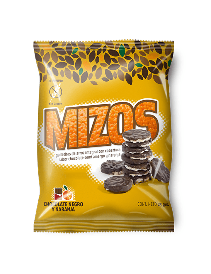 Deliciosas galletas de arroz integral cubiertas con chocolate naranja. Snack apto para celíacos.