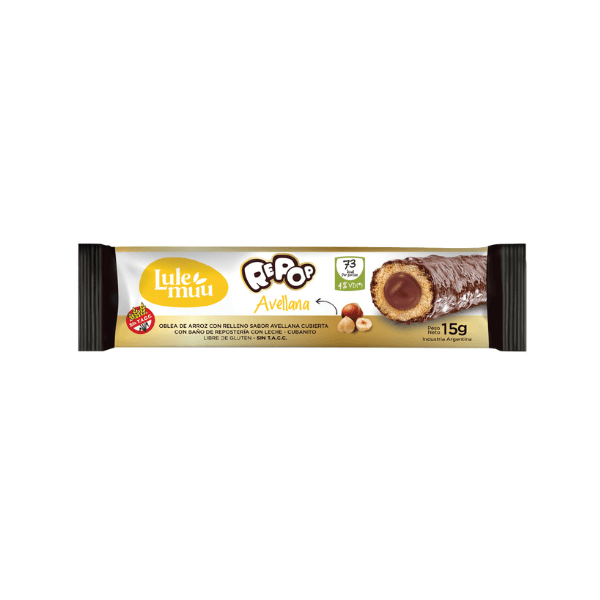 Oblea de arroz con relleno sabor avellana cubierta con baño de repostería con leche.